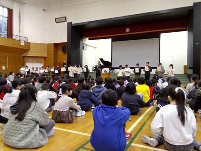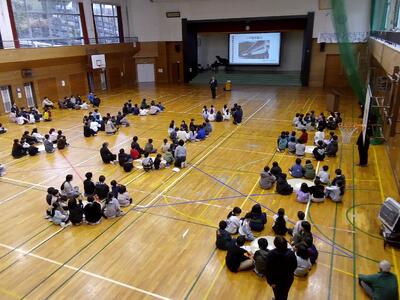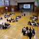いつもとは趣向を変えて、縦割り班での終業式になりました。