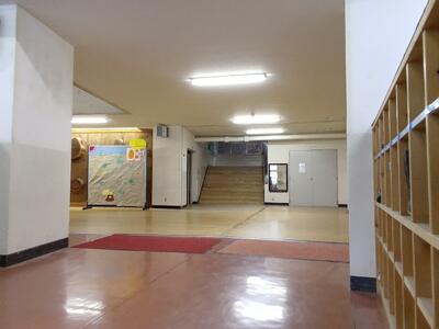 この写真は、福島小学校の昇降口です。下駄箱から階段までの光景ですが、今までと何かが違います。あるものが1つ増えました。一体何だと思いますか?