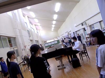 チャイムが鳴ると、誰に言われるでもなく、何人もの子が音楽室へ向かいます。おのおの楽譜を手に、自然と練習が始まります。校舎には、途切れることなく子どもたちの歌声や音楽が響いています。福島の日常に、音楽が溶け込んでいるのです。