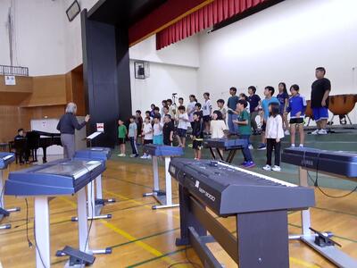 授業では、楽器パートに分かれての練習が始まりました。鉄琴の涼やかな響き、ドラムの激しい鼓動、リコーダーや鍵盤ハーモニカの懐かしい音色、お互いの音を聴き合い、支え合う。先生が階名で歌うCDが、子どもたちのゆく道を照らします。