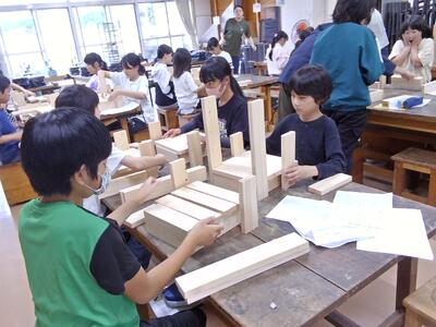 木工クラブでは、ヒノキの香りの中で、椅子づくりに挑戦。図工室の壁のモナ・リザや、デザイン用石膏も、子どもたちの活動を見守っていました。