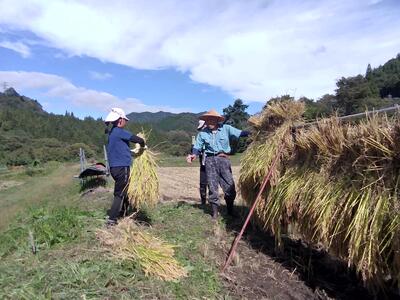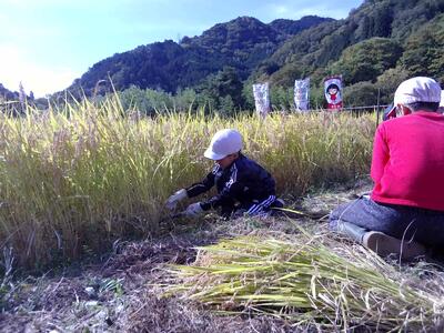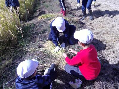 子供たちは3人1組になり、鎌で刈る人、受け取る人、束にしばる人に分かれて作業を進めました。