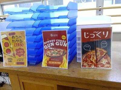 もちろん、教科書を使った学習プリントも用意されています。自分の進度に合わせて、3つの種類のプリントを選べるようになっています。ポスターは児童用タブレット内のアプリで作ってあります。もちろん、子供たちもこのアプリを使って動画やポスター等を作っています。また、タブレット内のソフトで、学習プリントを使えるようにもしてあります。紙よりもタブレットを好む子も大喜びです。