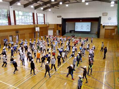 朝の時間、全校児童が集まり「全校体育」を行いました。 木曽の豊かな自然に囲まれた本校では、子供たちがのびのびと体を動かす時間を大切にしています。